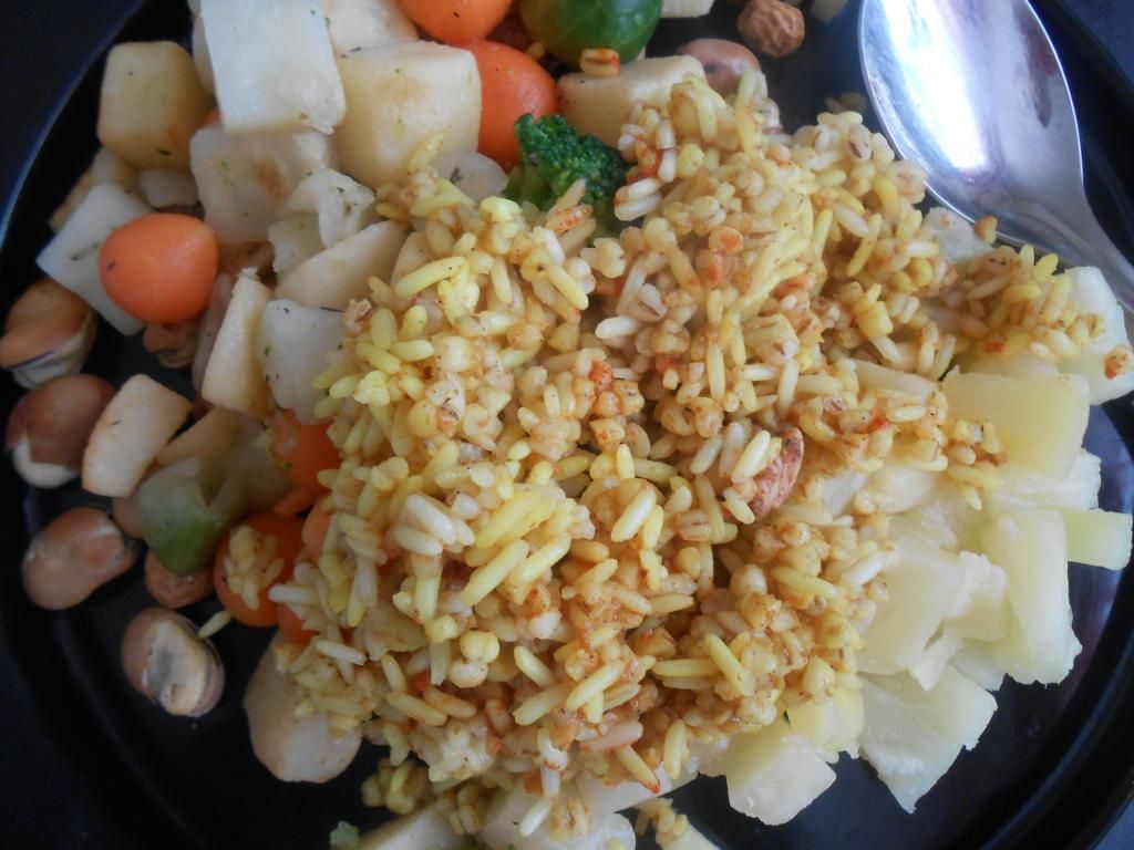 Tein reseptiin kuitenkin vähän muunnelmia, koska kaapissani ei ollut couscousia/bulguria, mutta jyväisää viljaa eli hirssiä kylläkin. Edellä mainitut ja kvinoa ovat mielestäni ihania kasvisruoan lisukkeita, ovat hyviä proteiinin- ja kuidunlähteitä ja pitävät kylläisenä, ainakin jos ovat täysjyvävaihtoehtoja.